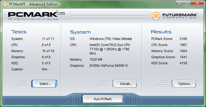 Analizando el rendimiento de la máquina. Si entendemos por ordenador portátil de gama alta uno que corra mucho, que permita jugar al crisis o al Unreal Tournament 3, entonces el U3S no es para nosotros, no es un ordenador para jugar, aunque se pueda hacer a muchos juegos actuales, porque aunque su 8400GS no es la reina de los benchmarks nos ofrece un soporte 3D respetable más que suficiente para juegos MMORPG o de estrategia y a muchos FPS que no sean de la última hornada. Además ofrece buenas prestaciones de reproducción de video HD lo que a mi entender es aun más importante que el que pueda ejecutar el Crysis sin problemas. Expuestos nuestros principios de pruebas sobre este portátil añadiré algunos test de rendimiento generalistas, de funcionamiento general y sobretodo nuestra relación con el aparato y las sensaciones que nos ha producido. En cuanto a autonomía, nuestro modelo venia de serie con la versión de 6 celdas, hay opciones de 3, 6 y 9 celdas, con una autonomía real de 3 horas con la 8400GS y unas 3 horas y 20 minutos con las 3100 de Intel. No es un record pero si cambiamos la batería por el modelo de 9 celdas tendremos fácil una autonomía de más de 4 horas y media o quizás 5 con la Intel activada.
