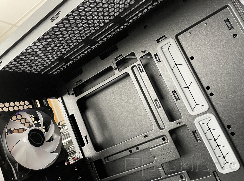 En la zona trasera se encuentra el cuarto ventilador instalado de fábrica. También con capacidad ARGB, pero de menor calidad y tamaño. Se trata de un CF120 ARGB con frecuencias de trabajo entre las 650 y las 1200rpm. Es un ventilador más básico, de extracción de aire para caja. En el techo, que de serie va despejado podemos instalar tres ventiladores de 120mm o hasta dos ventiladores de 140mm.