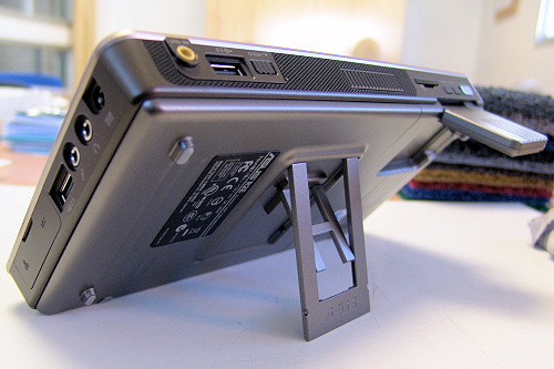 Un solo conector MiniUSB y el lápiz de control encontraremos en el lateral izquierdo.Otro de sus puntos de pérdida de rendimiento sin duda se encuentra en el disco duro de 30GB de 1.8”. Asus debería dar alguna opción a integrar ya un disco SSD para los usuarios que miren más por las prestaciones que por el precio. Yo creo que mejoraría notablemente los tiempos de carga y seria todavía más seguro. Otros fabricantes de UMPC dan este tipo de opción y dentro de lo que cabe han tenido bastante éxito entre sus clientes. El diseño del R2 es muy compacto, apenas el tamaño de las 7” de pantalla y tres centímetros a cada lado para dar espacio a los controles ya descritos. En la parte superior de la pantalla encontramos también una webcam de 1.3mp y dispone de un solo altavoz situado abajo a la izquierda. Por supuesto cuenta también con salidas de auriculares y entrada de línea. Su conectividad es bastante buena. Cuenta con tres puertos USB 2.0 aunque uno de ellos es mini USB a bien de usarlo como interfaz rápido de teclados externos. Por supuesto es adaptable y el adaptador viene con el aparato. Los otros dos puertos son normales y cada uno de los tres está situado en uno lado diferente del aparato. También cuenta que salida Ethernet para redes alámbricas y conexión VGA. Estas dos salidas al tener un uso mas esporádico están protegidos mediante una tapa flexible. No esta mal el dispone de tres puertos USB sobretodo si tenemos en cuenta el nivel de integración de la maquina y que contamos con Bluetooth 2.0 para otras necesidades de conectividad. Hay que destacar también que la antena GPS es direccionable y también admite antenas fijas de ampliación de señal. También contamos con botones de acceso rápido a la conectividad Wireless y varios leds de estado con detallada información del funcionamiento del disco duro, Wireless, Wifi, encendido y estado de la batería. Podemos usarlo también tumbado o sobre una pata extensible situada en la parte posterior. La pata deja al R2E en una posición muy cómoda para su uso sobre una mesa con un teclado y un ratón externos.
