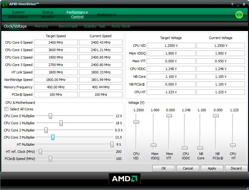 El Phenom 9600 Black Edition trabaja a una frecuencia de 2.3GHz, con un bus de real de 200MHz y un multiplicador de 11.5 veces su bus interno. Si intentamos hacer overclocking a este procesador lo mas que lograremos serán unos 200MHz mas de frecuencia y seguramente tengamos problemas de estabilidad así que por sus 210€ de coste tendremos que conformarnos de momento con lo que es capaz de dar a su frecuencia de trabajo marcada en fábrica. Lo que si tiene muy bueno este procesador, y mejor aun seria si se dejase subir un poco más, es la aplicación “AMD Overdrive” que AMD estrenó para estos procesadores. Es una gran herramienta tanto a nivel informativo sino también de manipulación de aspectos del procesador tan fundamentales como su bus frontal o su multiplicador interno. Podemos controlar el multiplicador de cada uno de los núcleos de forma independiente en tiempo real y sin salir de Windows.