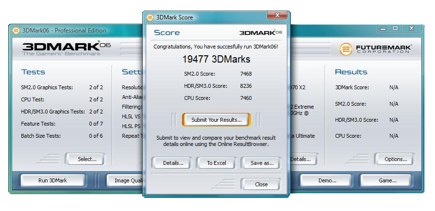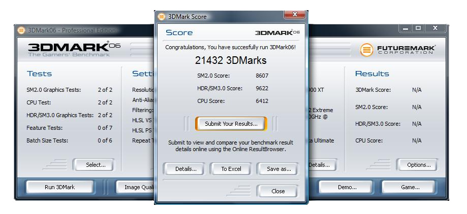 Futuremark 3DMark 2006. 3Dmark es una prueba que combina resultados puros de CPU, con puros de grafica, para darnos un resultado global. Es interesante ver el rendimiento 3D de estos sistemas comparados el uno contra el otro en condiciones de tarjeta grafica idéntica.
