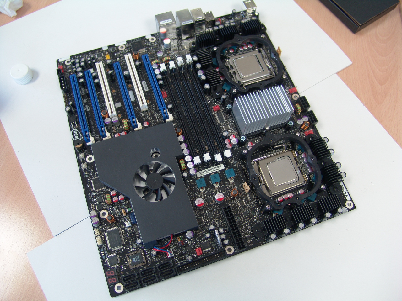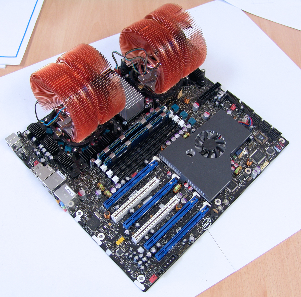 Nuestro overclocking. Esta placa, aunque tiene funciones, no está para ir cacharreando con buses, está pensada para que hagamos el overclocking mediante el cambio del multiplicador del procesador. Nosotros hemos usado esta técnica y hemos conseguido, con un pequeño aumento de voltaje hasta los 1.325v, los 4GHz mediante el uso de un multiplicador de 10x. Esto supone un overclocking del 25%, que no es mucho para estos procesadores, pero si suficiente para que ambos superen los 4GHz de frecuencia consiguiendo un rendimiento sobresaliente en todos los sentidos. Sus procesadores no son los más frescos del catalogo de Intel pero si no fuera por el ventilador del puente sur de la placa D5400XS la verdad es que se podría lograr un ordenador relativamente silencioso. Esta placa, a diferencia de otra skulltrail que prepara Asus, usa el anclaje de una placa de socket 775 lo que aumenta su compatibilidad con todo tipo de disipadores que utilizan este socket en sus medios de anclaje. La variedad es mucho más extensa que el anclaje típico de socket LGA771 debido sin duda a que este socket está orientado a un usuario profesional que no suele requerir una disipación mejorada.