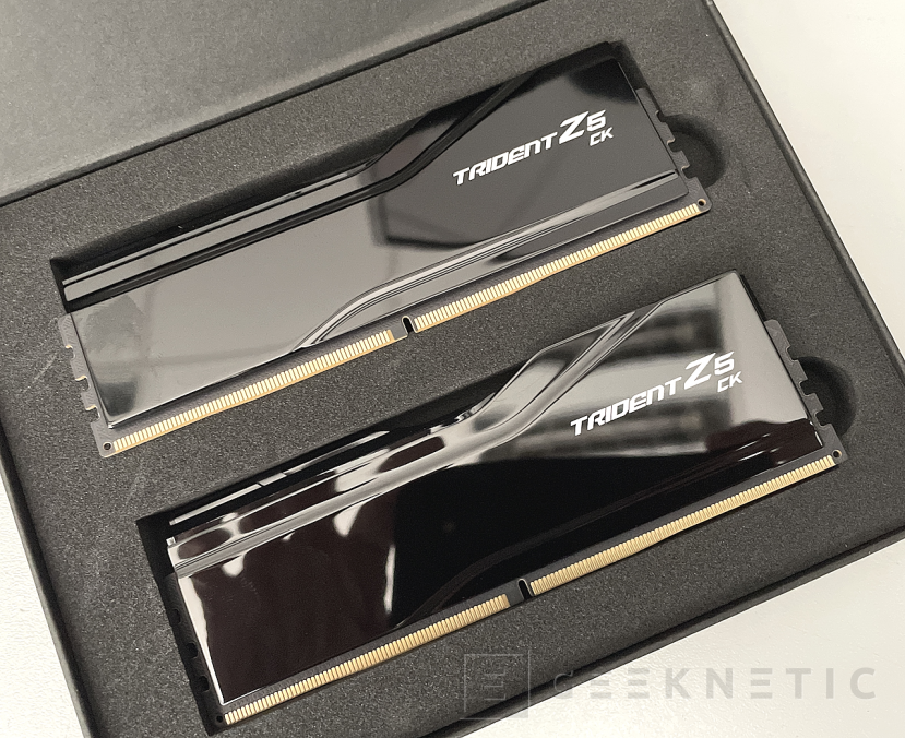 El diseño del que os hablaba está basado en los disipadores de la serie Trident Z5, pero en este modelo no encontramos nada de iluminación. Es completamente negro y con un magnífico y excelente acabado negro piano que combina un bonito brillo con un negro profundo que parece absorber toda la luz. Son los módulos más bonitos que he visto en mucho tiempo, y sin necesidad de iluminación alguna.