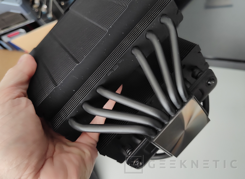 Todo el conjunto está tratado en un acabado completamente negro y mate, con cubiertas de aluminio para que las soldaduras de las heatpipes en la zona superior. Son un total de seis, que permiten distribuir el calor adecuadamente por toda la estructura de aluminio. Esto se hace eficientemente desde la base de cobre acabada en níquel, que tiene un cepillado concéntrico, con una calidad excepcional.