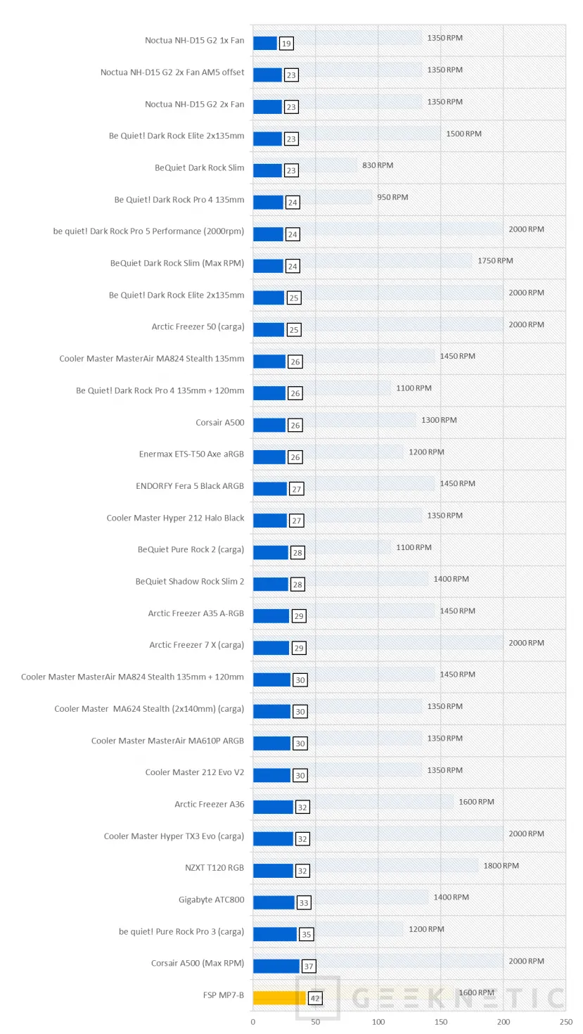 Este es un buen disipador, destinado para esos procesadores actuales que tienen modos de rendimiento intensos en fases de turbo, donde un disipador de 65W puede superar los 150 o incluso llegar a los 190W. En estas condiciones el FSP MP7-B se comporta de maravilla.