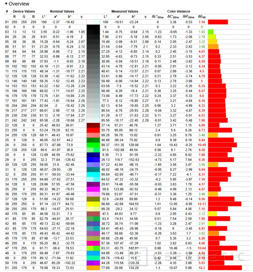 La calibración de fábrica del portátil es mejorable, con una desviación media de 6,05 puntos debida, en gran medida, a la tendencia hacia tonos azulados y verdosos que muestra en la escala de grises. colores como el naranja también tienen una desviación bastante amplia. Todo ello se puede corregir con una calibración con colorímetro que nos permitirá utilizar este equipo para tareas de diseño.