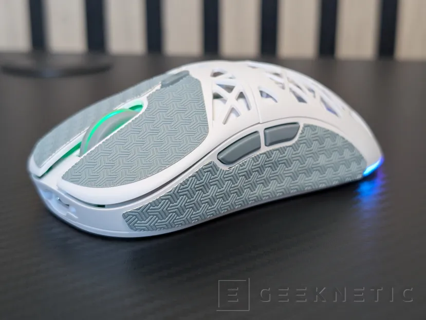 Una de las novedades que incluye esta versión blanca, además de la rebaja de precio (que también recibe el modelo negro), es la inclusión de unos pads de goma adhesivos que mejorar el agarre. Aunque al colocarlo perdemos parte del diseño "perforado", lo cierto es que no quedan nada mal, y el tacto y agarre del ratón mejora.