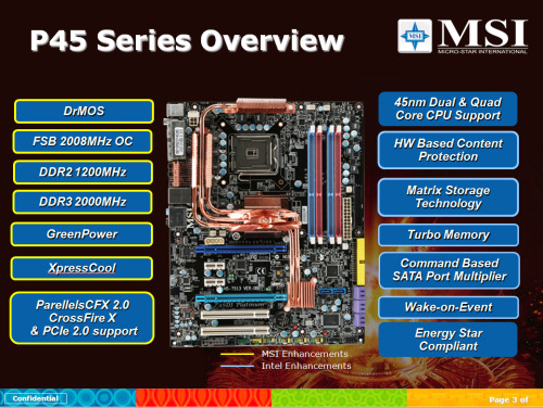 Conclusión El P45 no nos trae ninguna tecnología novedosa que no hayamos visto en otros chipsets pero permitirá a muchos usuarios que prefieren las soluciones Intel una forma alternativa y mas económica de disponer de tecnologías ya disponibles en otros chipsets como el PCI Express 2.0 ya introducido en el X38. También es la primera opción de gama media que soporta en un chipset Intel Crossfire de modo síncrono así que se convertirá en una solución ideal para aquellos que optan por una solución grafica múltiple en un entorno mas o menos económico. Esta opción de MSI sin duda será de las mas interesantes por su magnifico sistema de ahorro energético así como su impresionante eficiencia energética y su fresco sistema de alimentación para el procesador. Será interesante repasar las capacidades de este placa una vez que MSI tenga versiones productivas en el mercado.