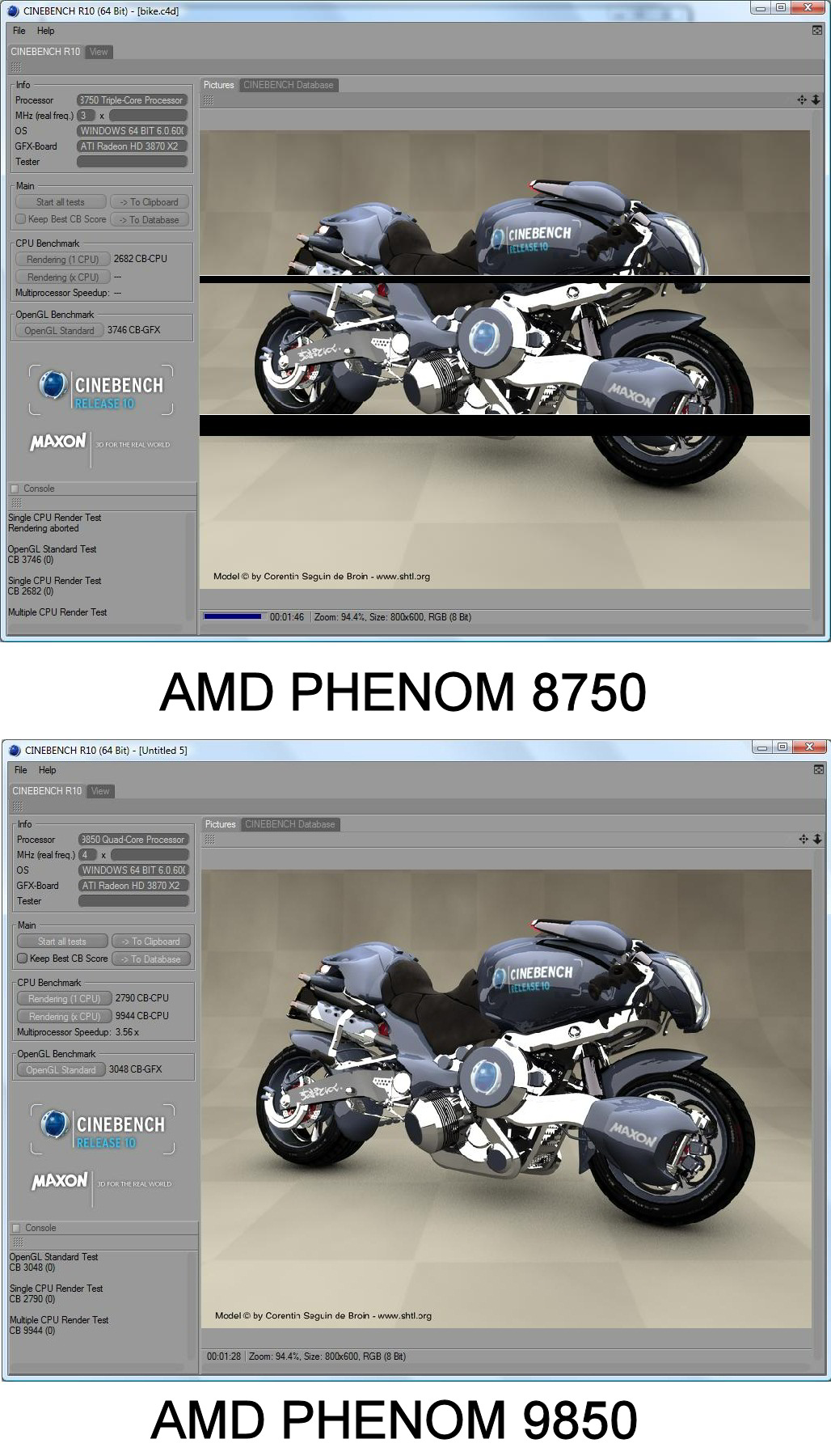 Probando el rendimiento de nuestros procesadores. Para comprobar el rendimiento de estas dos nuevas ofertas de AMD hemos realizado una breve pero completa batería de pruebas donde veremos las diferencias de contar con tres o cuatro núcleos y donde ver también el rendimiento general de estos procesadores. Las piezas comunes usadas para ambos son las siguientes: Procesadores: AMD Phenom 8750 y Phenom 9850 Black Edition Memoria: OCZ HTC Reaper 1066 (4x1024) Disco duro: WD Raptor 36GB Placa base: Asus M3A-H/HDMI Fuente: PC Power & Cooling Silencer 750W Disipador: AMD oficial. S.Operativo: Windows Vista Ultimate 64-Bit. T.Grafica: Radeon 3870X2 1GB. La batería de pruebas nos dirá si los 30€ de coste que separan a estos dos procesadores compensan o no. Actualmente podemos encontrar el Phenom de tres núcleos, el 8750, por unos 164€ y el Black Edition de cuatro núcleos, 9850, por unos 194€. De frecuencias de trabajo andan muy parejos con 2400MHz para el 8750 y 2500MHz para el 9850.