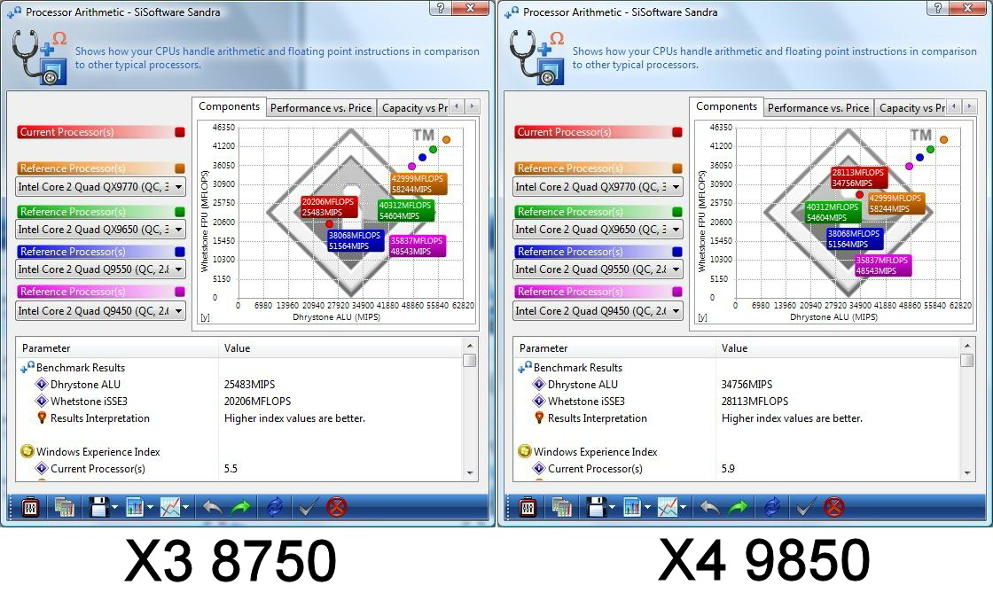 Comparativa de resultados En estas capturas podréis comprobar las diferencias de rendimiento de estos procesadores en los diversos test a los que los hemos sometido. Son pruebas sintéticas que nos ofrecen un punto de vista teórico sobre el rendimiento de estos procesadores en entornos donde el multiproceso sea factible. Hay que tener en cuenta que el 9850 no solo tiene un núcleo mas sino que trabaja a 100MHz mas que su competidor.