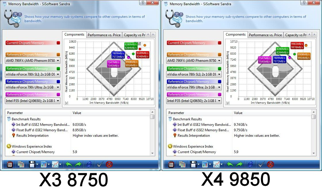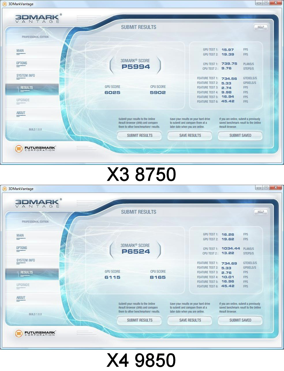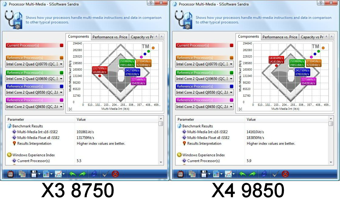 En el índice de rendimiento de Windows Vista ambos equipos logran el mismo resultado limitados por el rendimiento del disco duro pero en la segunda captura, correspondiente al procesador de cuatro núcleos, se ve una placa diferencia de rendimiento que permite al 9850 alcanzar el máximo rendimiento de procesador de esta prueba dejando taras por cuatro décimas al 8750.