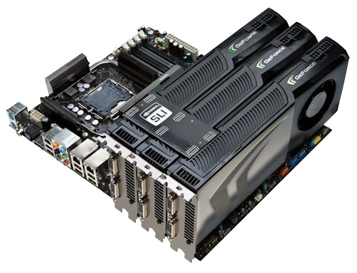 Este modelo permite su conexión en modos SLI de hasta tres tarjetas iguales. Esto la convierte sin lugar a dudas en el sistema grafico más avanzado en el catalogo de Nvidia por delante de las 9800GX2 pero también requiere de una fuente con una capacidad combinada de más de 70A a 12v para suministrarles energía de forma correcta. 700W de consumo solo para el sistema grafico. Es sin duda una gráfica de gran potencial técnico que promete con un solo chip superar en velocidad a una grafica de dos chips como la 9800GX2 aunque curiosamente generando aun más calor que esta última. De hecho ATI ha llamado a este chip como el último sistema gráfico de alto rendimiento de un solo chip, ellos ya han tomado el camino del uso de múltiples núcleos para conseguir estos niveles, y personalmente creo que Nvidia también es consciente que este modelo nos le durara más allá de esta generación.