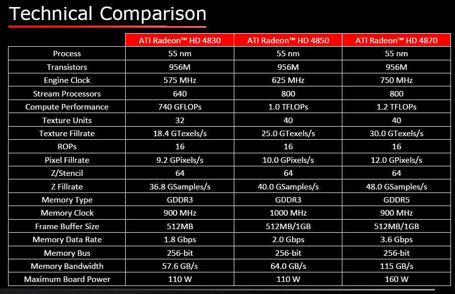 En el siguiente esquema podemos ver cuáles son las diferencias arquitectónicas de esta tarjeta con respecto a sus competidoras directas como son la Radeon 4850 y la Radeon 4870. Como veis las diferencias no solo radican en los cambios de frecuencia sino en otros aspectos más importantes como el número de unidades “Stream Processors” que se reducen de 800 a 640 unidades. Las frecuencias de memoria también se reducen, dejando una ancho de banda que ronda los 58GB/s, y las TMUs también pasan de 40 a 32 unidades. Lo que si se mantiene, por suerte, son los 16 ROPs, así que no se pierde demasiada capacidad de relleno de pantalla salvo por la reducción del ancho de banda y el 20 de las TMUs. Aun así sus números son notablemente superiores a los de la Radeon 4670.