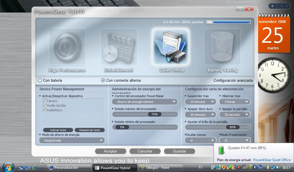 Windows Vista como sistema operativo. No es la primera vez que probamos un Netbook con procesadores Atom con Windows Vista y para nosotros las sensaciones nunca han sido malas. Este pequeño mueve Windows Vista con soltura gracias sobretodo a su disco duro de 5400 vueltas y a sus 2GB de memoria RAM integradas. Con estas características y gracias al sistema de Hyperthreading del Atom la verdad es que a Windows Vista se le ve suelto y ágil. Hay que tener en cuenta que la tarjeta grafica Nvidia también mejora mucho el comportamiento del interfaz Aero de este sistema operativo. El Asus N10J también dispone del ya archiconocido Expressgate de Asus. Este sistema operativo Linux de arranque rápido permite en menos de 10 segundos disponer de algunas funciones fundamentales como conectividad de red inalámbrica, navegador, Skype y algunas otras aplicaciones que nos pueden sacar de un apuro en cualquier momento.
