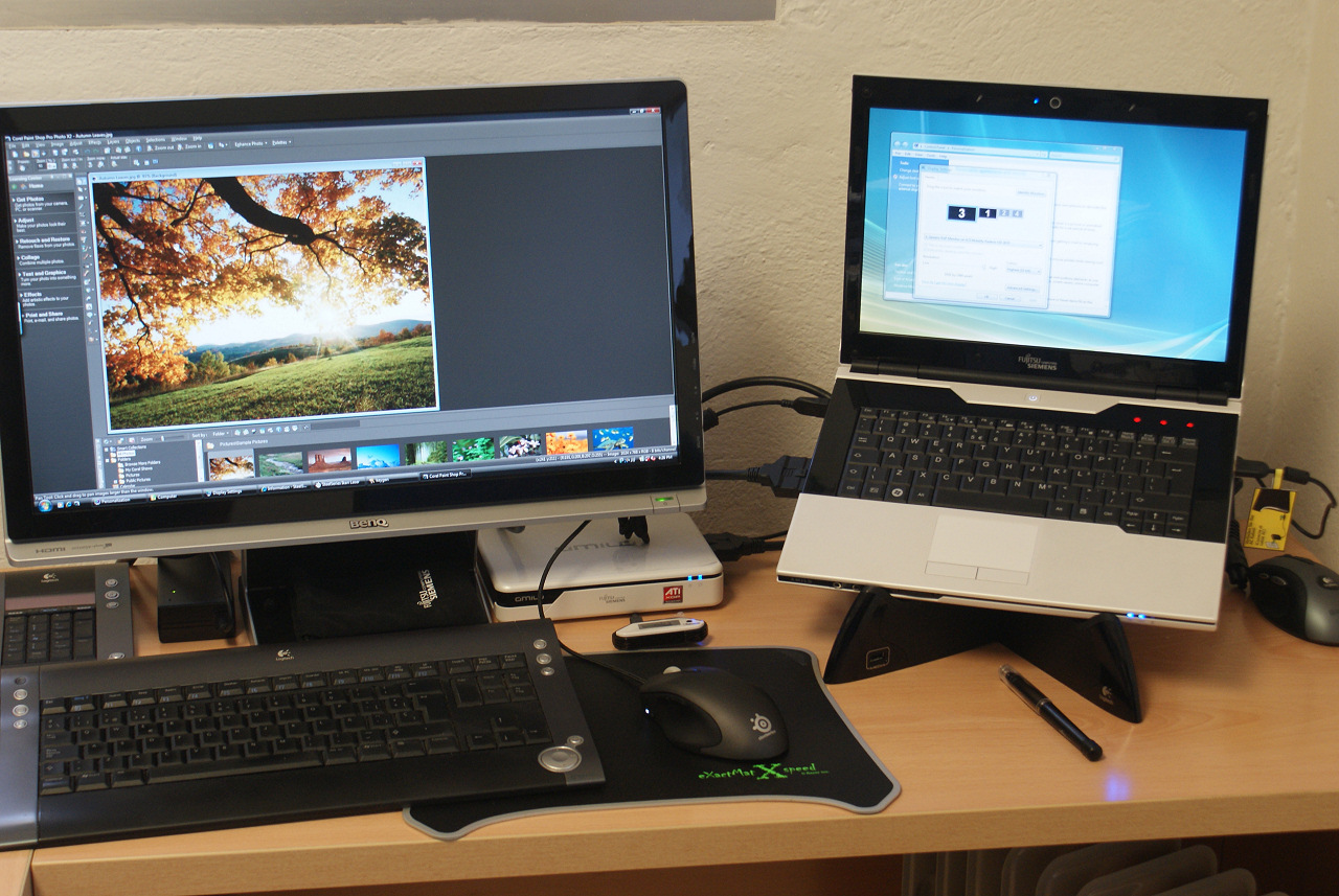 Podemos usar la pantalla del portátil con la aceleración del XGP.Fujitsu-Siemens denomina a esta unidad como AMILO Graphicsbooster pero esta pequeña caja no solo dispone de gráficos dedicados de alta velocidad, concretamente un Radeon mobilty HD 3870 con 511MB, sino que añade otras conexiones muy útiles para usar otros periféricos habituales en un entorno sobremesa que queden activos en el mismo instante en el que conectamos el puertos de comunicaciones. Concretamente encontraremos dos puertos USB 2.0 que se añaden a la conexión DVI, compatible con VGA, y a la conexión HDMI de que dispone la caja. De este modo el XGP se convierte en un duplicador de puertos sobremesa que nos permitirá “pinchar” rápidamente nuestro portátil ultraligero y convertirlo en una maquina sobremesa de altas prestaciones.