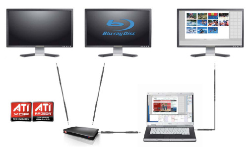 El XGP añade también una interesante y extensa forma de manejar las pantallas que usemos. Podemos utilizar las múltiples salidas para montar hasta un sistema de cuatro monitores entre la propia pantalla del portátil así como las salidas de monitor de éste, sumadas a las que soporta el XGP. También podemos aprovechar la aceleración del XGP con la pantalla del portátil ofreciendo un sinfín de combinaciones accesibles gracias a la integración total del controlador ATI tanto para el control del XGP como de la grafica integrada en el portátil. El XGP también ofrecerá posibilidades Crossfire ya que encontraremos en el mercado, o eso encontramos en la documentación de ATI, posibles configuraciones XGP con dos GPUs ATI instaladas en la misma “caja”. Incluirá su propio Switch PCI Express de 32 líneas para alimentar a los dos chips de la forma adecuada. Lo que se contempla en todas ellas es el hub USB que permita conectar periféricos de forma permanente en el XGP.