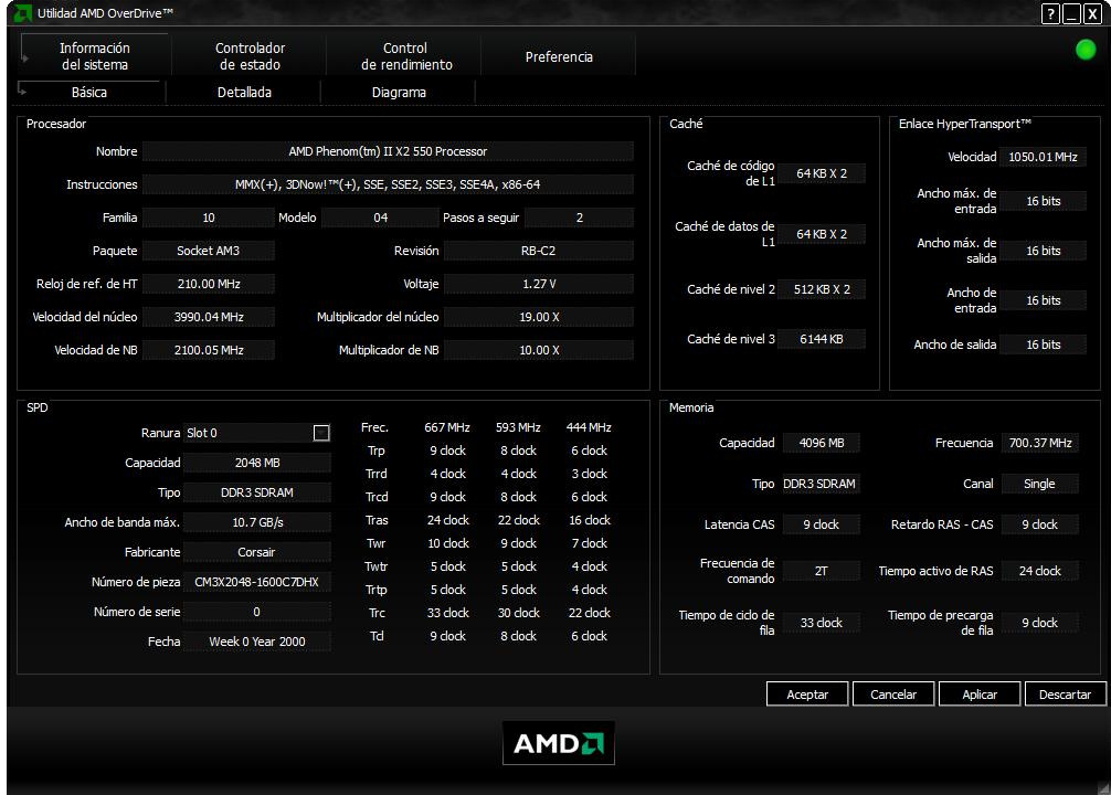 Introducción. Normalmente, si compramos con cabeza, cuando adquirimos un procesador de más de 100€ es porque buscamos algún tipo de rendimiento superior para aplicaciones mas especificas que manejar un sistema operativo, navegar por Internet y jugar a los SIMS. Pero algunos buscamos poder hacer lo que haríamos con un ordenador de alto rendimiento a un precio económico y es aquí donde compras como el Phenom 2 550 Black Edition puede ser nuestro punto de partida para lograr un ordenador muy capacitado a un bajo coste. Características y prestaciones. El Phenom 2 Black Edition 550 es un procesador basado en el núcleo Deneb de AMD que da vida a la última generación de procesadores Phenom 2 fabricados mediante un proceso de 45nm. El 550 dispone únicamente de 2 de los cuatro núcleos que caracteriza al Deneb. Estos núcleos están desactivados normalmente por problemas de estabilidad, son procesadores de cuatro núcleos de los cuales 1 o dos de ellos no están en condiciones para trabajar en configuraciones de cuatro núcleos o que simplemente han sido desactivados por requerimientos productivos a bien de cubrir demanda de ciertos procesadores, etc. Los núcleos restantes, que están desactivados en el Phenom 2 550, pueden ser activados con la placa base y la BIOS adecuada pero esto no garantiza un funcionamiento adecuado. Como decimos es cuestión de suerte que los núcleos hayan sido desactivados porque si o por estar “estropeados” así que si nuestra idea es comprar un procesador de este tipo para convertirlo fácilmente en un cuatro núcleos puede que nos demos de bruces con la dura realidad.