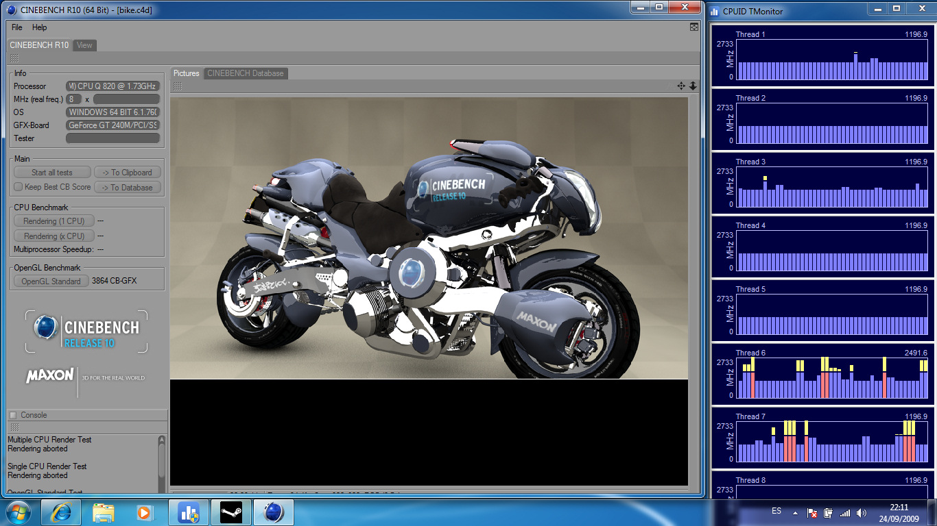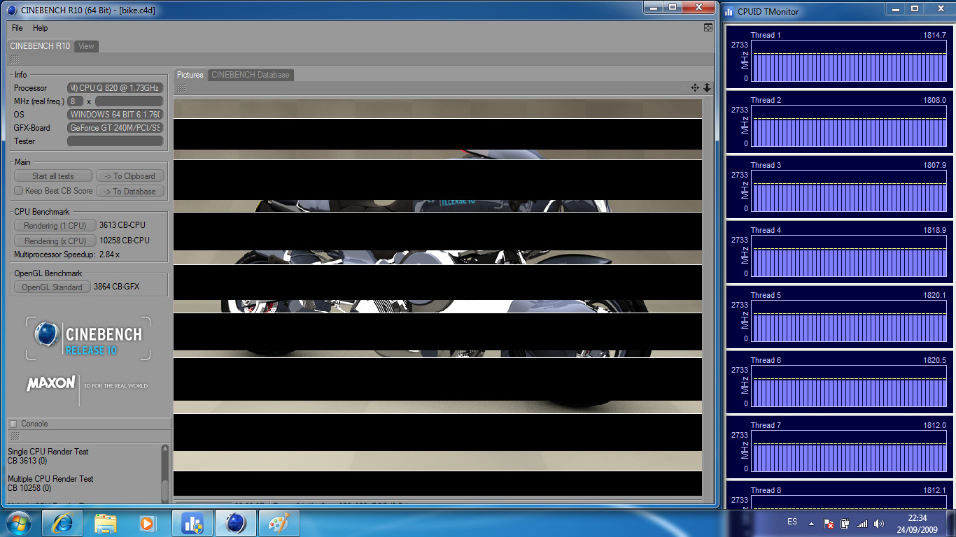 Rendimiento y TurboBoost Lo primero que quiero mostraros es como trabaja el modo TurboBoost de Intel en estos procesadores. Cinebench R10 es perfecto para este cometido porque permite correr el mismo test con un solo Thread o todos de forma simultanea. Ayudados por Tmonitor de CPUID.com podemos ver la carga y frecuencias del procesador en cada uno de sus Threads. En las imágenes se ve claramente como trabaja este sistema aumentando la frecuencia hasta los 2.7GHz cuando no requerimos de todos los núcleos simultáneamente y como se mantiene en 1.73GHz cuando hacemos uso de su capacidad de proceso en paralelo. Por supuesto esta segunda modalidad saca todo el rendimiento del procesador pero el modo Turbo nos permitirá disfrutar de un procesador rápido estén o no las aplicaciones preparadas para su potencial mutinúcleo.