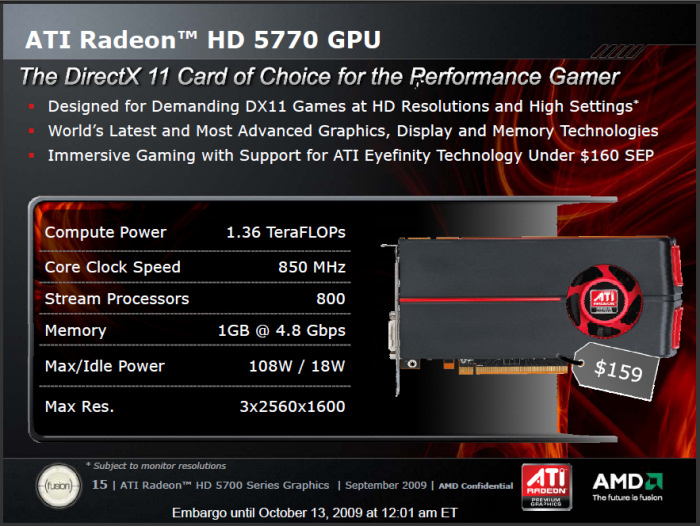 Introducción. En estas gamas de productos de AMD normalmente podemos encontrar un equilibrio bastante interesante entre potencia, consumo y precio. Son este tipo de productos los que luego realmente definen el éxito de una gama de productos ya que acercan las tecnologías de cada generación a un número mayor de usuarios y no solo por los precios sino también por los formatos y los requisitos de alimentación de la tarjeta. Hoy conoceremos cómo se comporta la Radeon 5770 en todos estos aspectos. Radeon 5770. DX11 a precio de crisis. Si algo hay que agradecer a AMD es que esta generación de tarjetas llegara en pocos días a todo tipo de mercados. No hace ni un mes cuando conocimos las nuevas gamas altas de tarjetas de un solo chip, de altas prestaciones, y ahora ya estamos hablando de sus versiones para usuarios que busquen la mejor inversión para sus apreciados Euros. Esto hace que cualquiera pueda acceder a las nuevas tecnologías que ofrecen los nuevos estándares que se introducen con Windows 7. De este tipo de tarjetas, que andan por estos precios, debemos esperar rendimiento equilibrado y suficiente para casi todo tipo de juegos en calidades moderadas, soporte para las últimas tecnologías de video y audio de alta definición y ahora también el soporte de aplicaciones basadas en computo general en diferentes estándares abiertos.