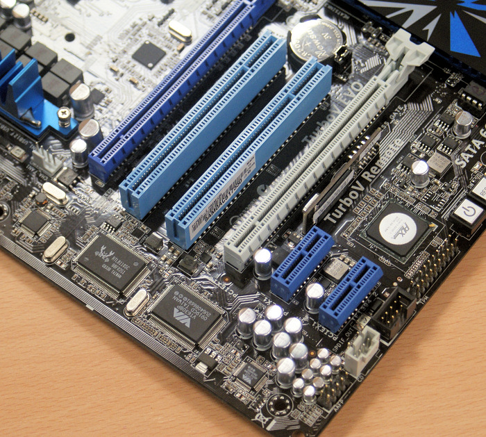 La integración se ha hecho con cabeza añadiendo los puentes necesarios para no tener cuellos de botella en las nuevas controladoras integradas.Todo esto no sale de la nada sino de una integración elevada de diversos chips que hacen las funciones a las que no llega el chipset P55 de Intel. En el caso de las controladoras más llamativas, la USB 3.0 y la Sata 3, hay que decir que van alimentadas, en cuanto a ancho de banda se refiere, mediante un “bridge” PLX (PCI Express 4x) similar al que se utiliza en soluciones graficas de doble chip como muchos de los modelos Radeon más potentes de las últimas generaciones. De este modo se consigue los anchos de banda necesarios para que la comunicación con el resto de componentes no sea una limitación para el uso de estas tecnologías. Otros detalles interesantes los encontramos en tecnologías como Expressgate, que esta placa ejecuta mediante una memoria SSD dispuesta al efecto, o en su buena distribución de los slots de ampliación donde encontraremos, aun usando dos tarjetas graficas de doble slot, siempre algún slot PCI de 32-Bit y un PCI Express libres para poder ampliar la funcionalidad del ordenador. Tambien contamos con un interesante accesorio a modo de mando a distancia donde realizar ajustes de frecuencia en tiempo real.