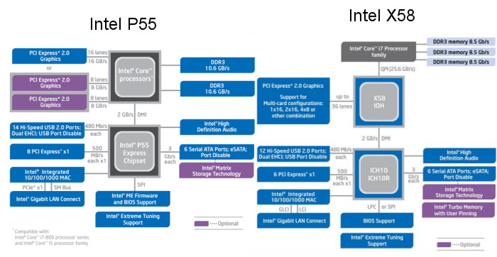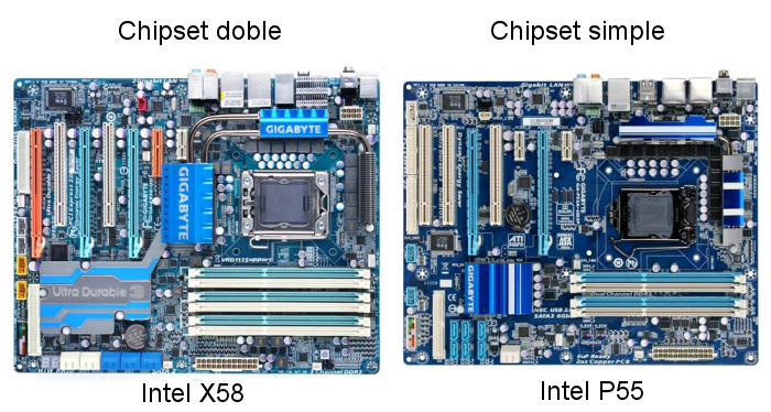 Introducción. Nuevos modelos como la Gigabyte GA-X58A-UD7 que nos recuerdan que el chipset X58 no está muerto y que en breve recibirá refuerzos importantes que le volverán a colocar como el socket de gama más alta de Intel con los procesadores domésticos más potentes de la marca. Para esta renovación se espera la integración de las últimas tecnologías que estamos empezando a ver en otros sockets como el 1156 que ya integra, en una gran mayoría de placas, soluciones dedicadas para dar soporte a tecnologías como el SATA-3 o el USB 3.0. Diferencias entre X58 y P55. Cada día que pasa tenemos más la sensación de que el socket 1366 de Intel ha quedado obsoleto y aunque el P55 introduce algunas mejoras notables, sobretodo la eliminación de uno del puente norte del chipset, el X58 sigue siendo el chipset más potente de Intel y donde encontramos las prestaciones más elevadas. Las diferencias entre ambas plataformas son en parte generadas por los propios procesadores y sus prestaciones nativas pero otras si dependen del chipset y de sus capacidades. La principal diferencia entre los procesadores es por un lado su bus Quickpath que en el caso de los procesadores de socket 1366 llega hasta los 6.4bits/s frente a los 4.8Gbits/s de sus hermanos pequeños de socket 1156. Su controladora de memoria también es más avanzada, con soporte de triple canal en el caso del socket 1366 y doble en el socket 1156, pero con más velocidad soportada oficialmente en el caso del socket 1156 con compatibilidad para memoria DDR3 de hasta 1333 frente a los 1066MHz de los procesadores de socket 1366. Estas diferencias de soporte de memoria también llevan a que los modelos de socket 1366 soporten hasta 24GB de RAM frente a los 16GB de los modelos de socket de 1156 pines.