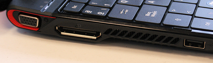 Lateral izquierdo. VGA, XGP, expulsión de aire caliente y puerto USB 2.0.