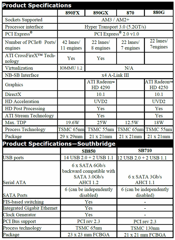 A la serie 890, que integran el puente sur SB850, de chipsets de gama alta les acompañan dos nuevos chipsets orientados para integración y presupuestos muy ajustados. Se trata de los nuevos 870 y 880G. Ambos chipsets integran un puente sur SB710 y el segundo también una gráfica integrada AMD Radeon 4250. La principal diferencia entre estas dos gamas es que el puente sur SB710 limita algunas prestaciones que introduce el SB850 como el soporte para Sata 6Gbps que solo está disponible en el SB850. También integra dos puertos USB 2.0 menos, quedándose en 12, y no integra algunas otras funciones como el chip Gigabit integrado. Son soluciones más económicas pero con soporte para los últimos procesadores de AMD incluidos los nuevos X6. El SB850 le ofrece a los chipsets de la serie 890 soporte para tecnologías como el Sata 6gbps así como una plataforma adecuada para la integración de chips dedicados para USB 3.0 con las líneas PCI Express adecuadas para que desarrollen todo su potencial. El 890FX integra un total de 42 líneas PCI Express y es capaz de montar dos tarjetas gráficas en links de 16x o cuatro en links de 8x.Es, por tanto, la plataforma ideal para AMD si queremos montar dos o más tarjetas gráficas simultáneamente.