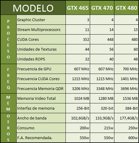 Introducción. Según avanzan los meses vemos nuevas opciones basadas en la última arquitectura de Nvidia que van reduciendo precios acercándose a más bolsillos. La pega es que según vemos reducciones de precios también vemos reducciones de las prestaciones a base de tijeretazos a las características técnicas de los chips que los componen. Actualmente podemos encontrar tres variantes del chip Fermi GF100 donde la GTX 465 compone la opción más económica pero también más limitada. Diferencias con sus hermanas mayores. La Geforce 465 es una tarjeta que costara en torno a los 250€, aunque al inicio este a precios un poco más elevados, que promete todo el potencial técnico del chip grafico Fermi. Las diferencias con sus hermanas mayores son: