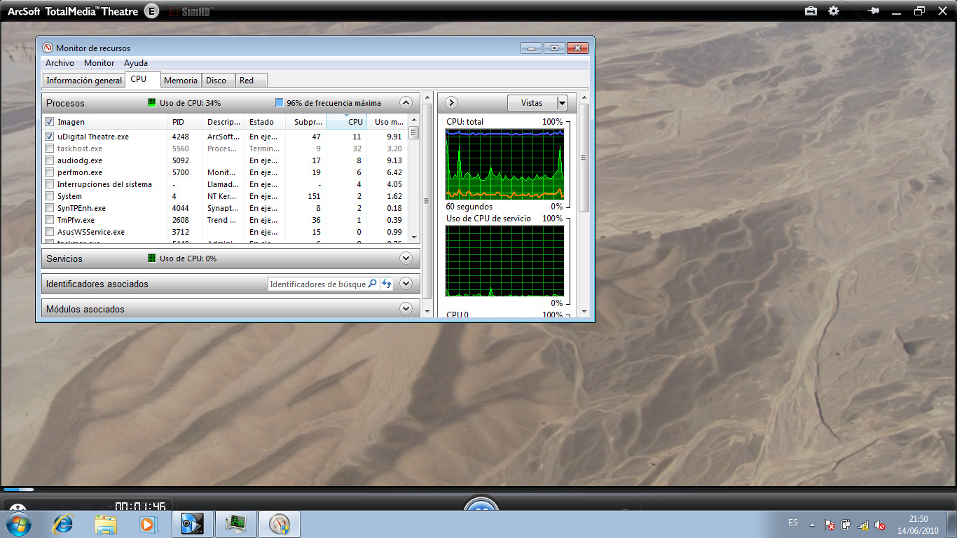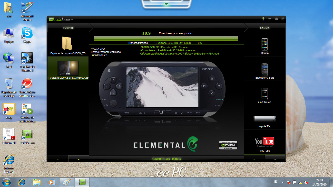 Y podemos también coger ese video 1080 y reconvertirlo al formato de una PSP a 19 FPS. El Atom suelto es 4 veces más lento en esta misma tarea.Asus ha escogido bien el sistema operativo, Windows 7 home, y las aplicaciones, donde encontramos programas como Totalmedia Theater, para que podamos aprovechar, desde el comienzo, las prestaciones graficas de este nuevo Netbook. Asus ha integrado también en Totalmedia Theater el Plugin "SimHD" que permite el sobreescalado de video de resolución convencional a alta resolución así que podremos ver cualquier video convencional en alta resolución mediante hardware gracias a la grafica Ion de esta maquina.