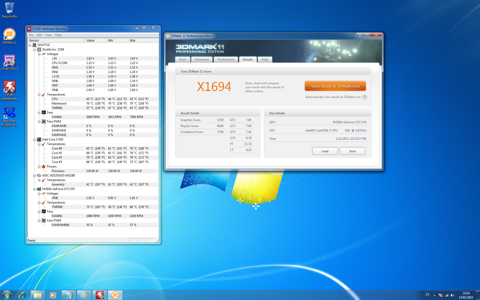 En esta captura encontrareis detalles térmicos de procesador, placa base y grafica en mínimos y máximos. Estos últimos forzados mediante la ejecución recursiva de 3DMark 2011 en su modalidad Extreme.Estos son algunos resultados de rendimiento: