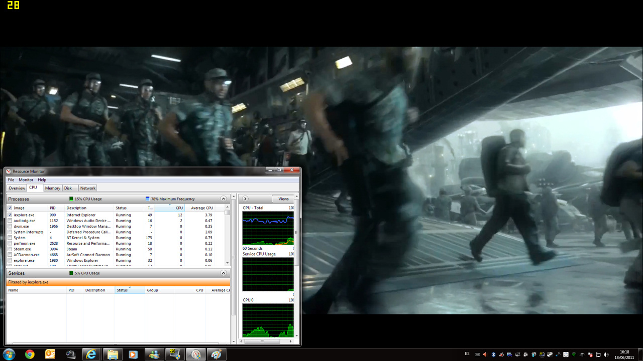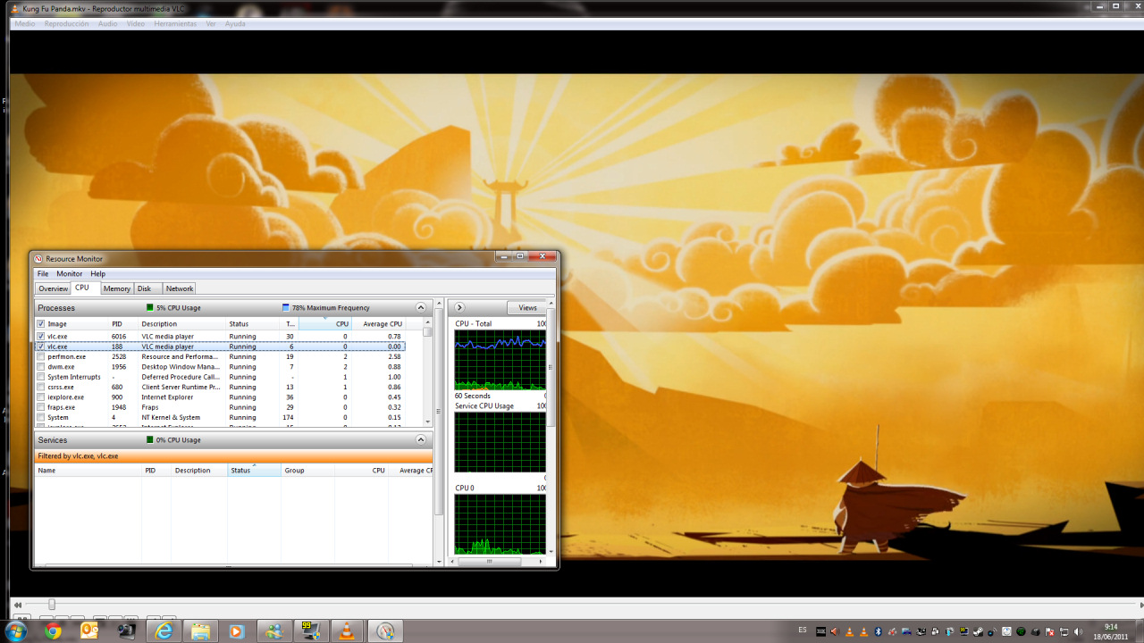 Con VLC y soporte DXVA podemos reproducir video de alta definición con consumo del 0% de CPU, como se ve en la captura.