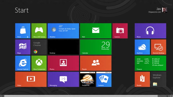 El nuevo interfaz de Windows 8 incorpora las técnicas que ya encontramos en otros sistemas operativos de la marca como es Windows Phone 7.5. Un interfaz principal donde las aplicaciones instaladas interactúan directamente y presentan información en tiempo real. Un interfaz rápido e intuitivo que de primeras al usuario de Windows 7 le parecerá que se han olvidado de el pero del que pronto uno se hace participe.