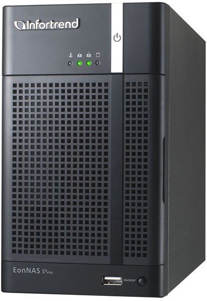 El nuevo EonNAS Pro 200 de Infortrend es una unidad de doble disco con capacidad RAID y buena capacidad de ampliación tanto en almacenamiento como en otros dispositivos añadidos como impresoras. Es una maquina orientada a almacenamiento de usuarios profesionales muy focalizado en estándares profesionales y en un rendimiento superior gracias a su procesador de doble núcleo x86, doble interfaz de red y 4GB de RAM instaladas de serie.