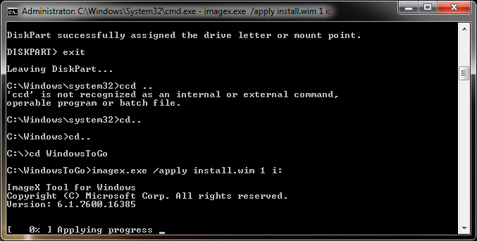 Transferimos el sistema en modo imagen para WindowsToGo. Para ello abriremos una consola “cmd” en modo administrador y nos dirigiremos a la carpeta “c:WindowsToGo” donde hemos colocado antes los archivos “imagex.exe” y “install.wim”. Ejecutamos el siguiente comando: “imagex.exe /apply install.wim 1 I:” (I: es nuestra letra de unidad, poned la que corresponda”. El proceso tardará más cuanto más lenta sea nuestra unidad. Un progreso porcentual nos tendrá informados del avance.
