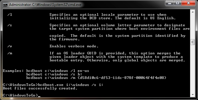 Por ultimo haremos que el sistema sea “booteable” con el siguiente comando: “bcdboot.exe I:windows /s”. Ya estamos preparados para ejecutar nuestro sistema Windows 8 To Go.