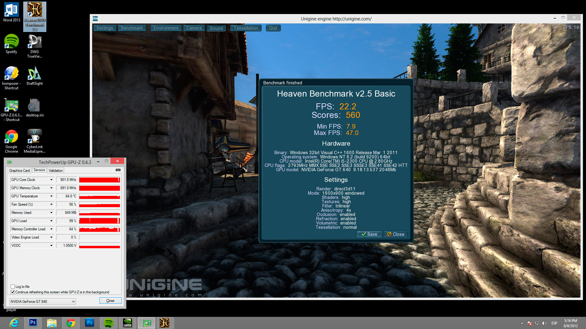 Geeknetic Zotac GeForce GT 640 Zone Edition 7 Diablo 3 a tasas de FPS muy interesantes con temperaturas de 65º en la GPU. Geeknetic Zotac GeForce GT 640 Zone Edition 8 Detalle de rendimiento en Unigine Heaven 2.5 a una resolución de 1600x900 con una temperatura de trabajo de 65º.