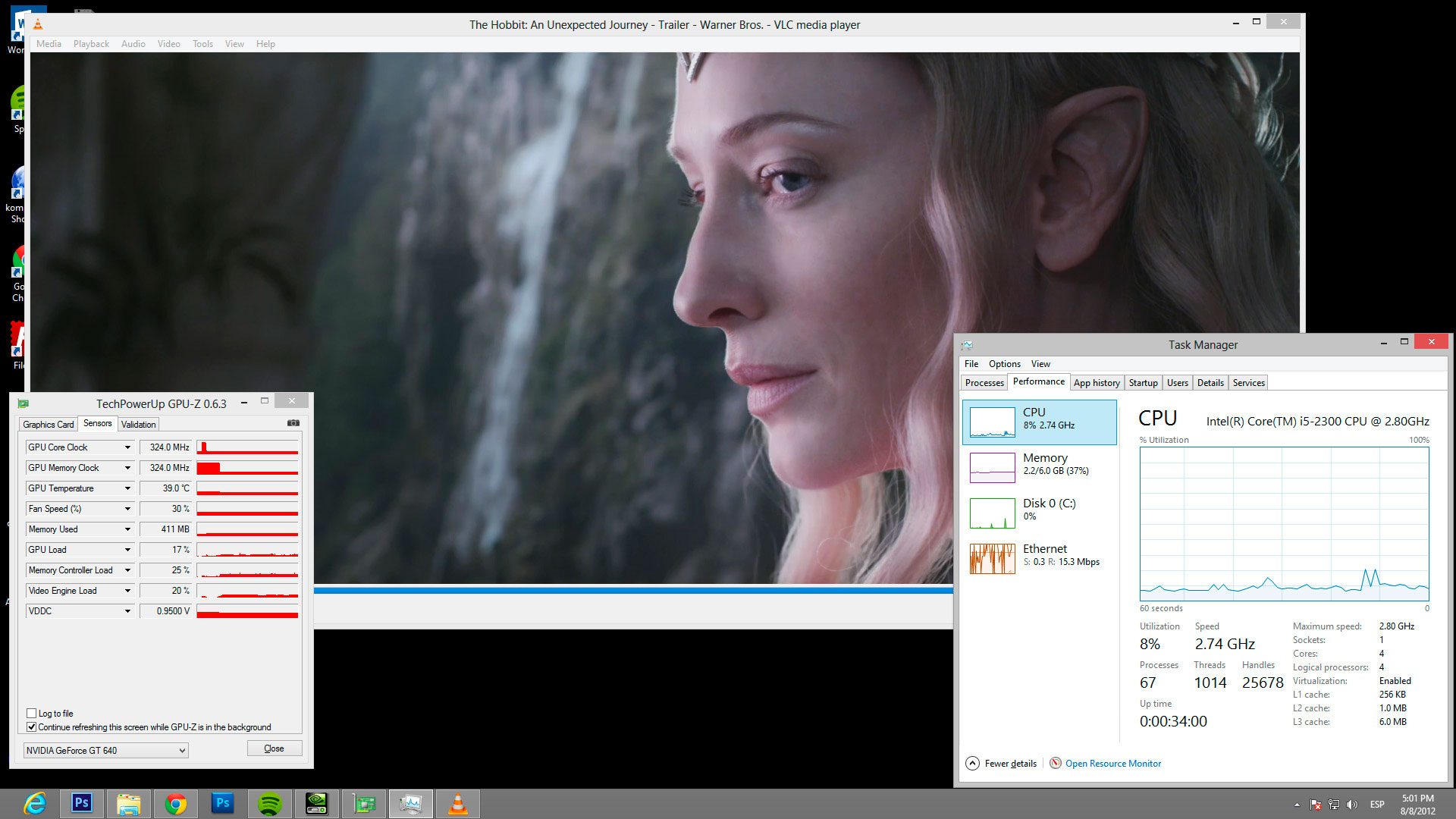 Probando temperaturas y rendimiento. Hemos realizado algunas pruebas ligeras de rendimiento comprobando las temperaturas de trabajo de la tarjeta. La Geforce GT 640 Zone de Zotac, en nuestra máquina de pruebas y a una temperatura ambiente de 26 grados, tiene un comportamiento en reposo que ronda los 30-35 grados de temperatura. Esto incluye, por ejemplo, reproducción de video asistido por hardware. Como podéis ver en la siguiente captura vemos la temperatura de trabajo además de como reducimos el consumo de CPU a tan solo un 8% gracias al aporte de hardware de la tarjeta gráfica. El video en cuestión es un tráiler de “El Hobbit” a resolución 1080p y alto bit-ratio. La temperatura no supera los 40º reproduciendo este tipo de video.