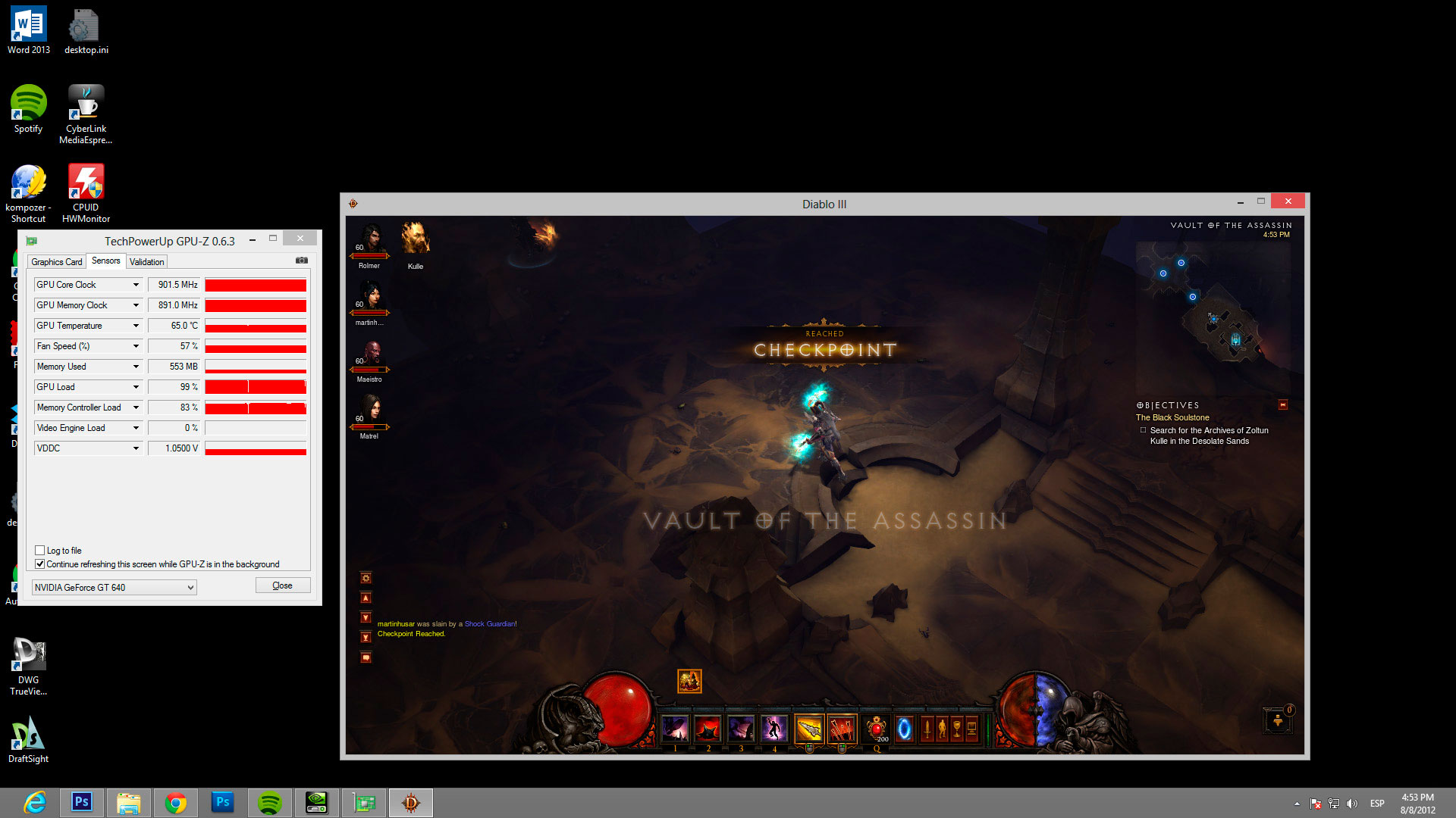 Para ver de verdad en que rangos de temperatura se puede mover esta tarjeta pasiva lo mejor es forzarla a trabajar al máximo de sus posibilidades. Hemos probado con dos programas: Diablo 3 y Unigine Heaven 2.5. Un  juego de características técnicas ideal para este motor gráfico y un benchmark muy exigente que obliga a la tarjeta a dar lo mejor de sí. En el caso del Diablo 3, al que muchos estaréis pegando duro desde hace ya algún tiempo, se mueve en calidades elevadas, con antialiasing y calidad alta, a 1920x1080 de resolución por encima de los 30FPS de forma continua. En este esfuerzo podemos ver la tarjeta trabajando a temperaturas cercanas a  los 65 grados. No es tanto como podíamos esperar ya que la tarjeta aún tiene un margen importante antes de que saltasen sus protecciones de temperatura. 65 grados está muy lejos de ese límite de 98 grados que Nvidia marca para este chip y nos habla bien y claro de que podemos confiar en el diseño de Zotac.