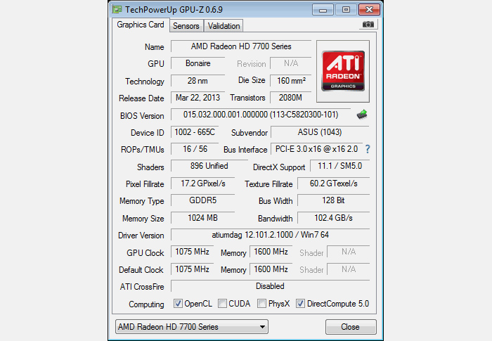 Nuestro modelo de pruebas, una ASUS DirectCU II, trabaja con frecuencias de 1075MHz para GPU y 6400gpbs para el bus de memoria de 128-Bit logrando más de 100GB/s de ancho de banda.