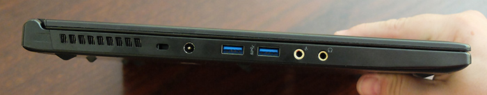 En el lateral izquierdo, más despejado, se concentran el conector de corriente, dos puertos USB 3.0 adicionales y los conectores de entrada y salida de audio analógico y digital. El cargador de esta unidad es un modelo Slim de 150w. La verdad bastante contenido para su potencia.