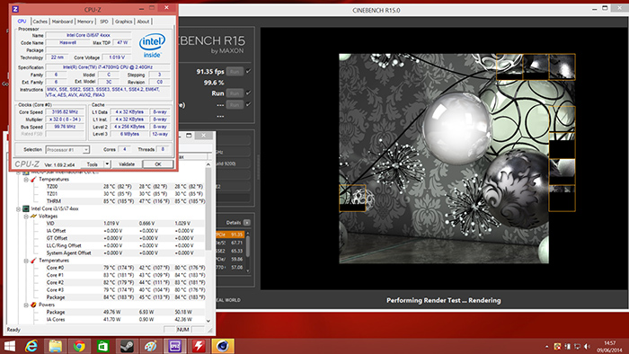 El procesador elegido por MSI es un Haswell Core i7-4700HQ con cuatro núcleos y ocho hilos de proceso. Un gran procesador con frecuencias nominales de 2.4GHz con modo turbo de hasta 3.4GHz. Un procesador de gama alta, potente como un sobremesa Sandybridge, y donde se nos presenta el primer efecto colateral de la reducción del espesor y por tanto de la capacidad de refrigeración de este portátil. MSI ha limitado los modos turbo de este procesador a un máximo de 3.2GHz, un 6% menos de rendimiento, aunque ciertamente mantiene muy estable la frecuencia de 3.2GHz en carga lo cierto es que aquí tenemos la primera limitación de rendimiento para el usuarios.