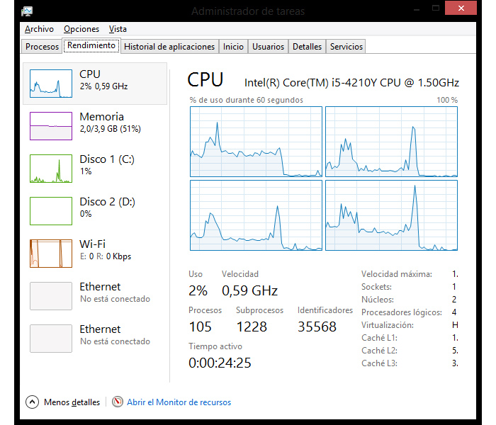 El Core i5-4210Y es, como procesador puro y duro, un pelin más rápido que el Celeron J1900 Baytrail-D. Este es un procesador con algo más de consumo, cuatro núcleos nativos y con mayores frecuencias de trabajo.